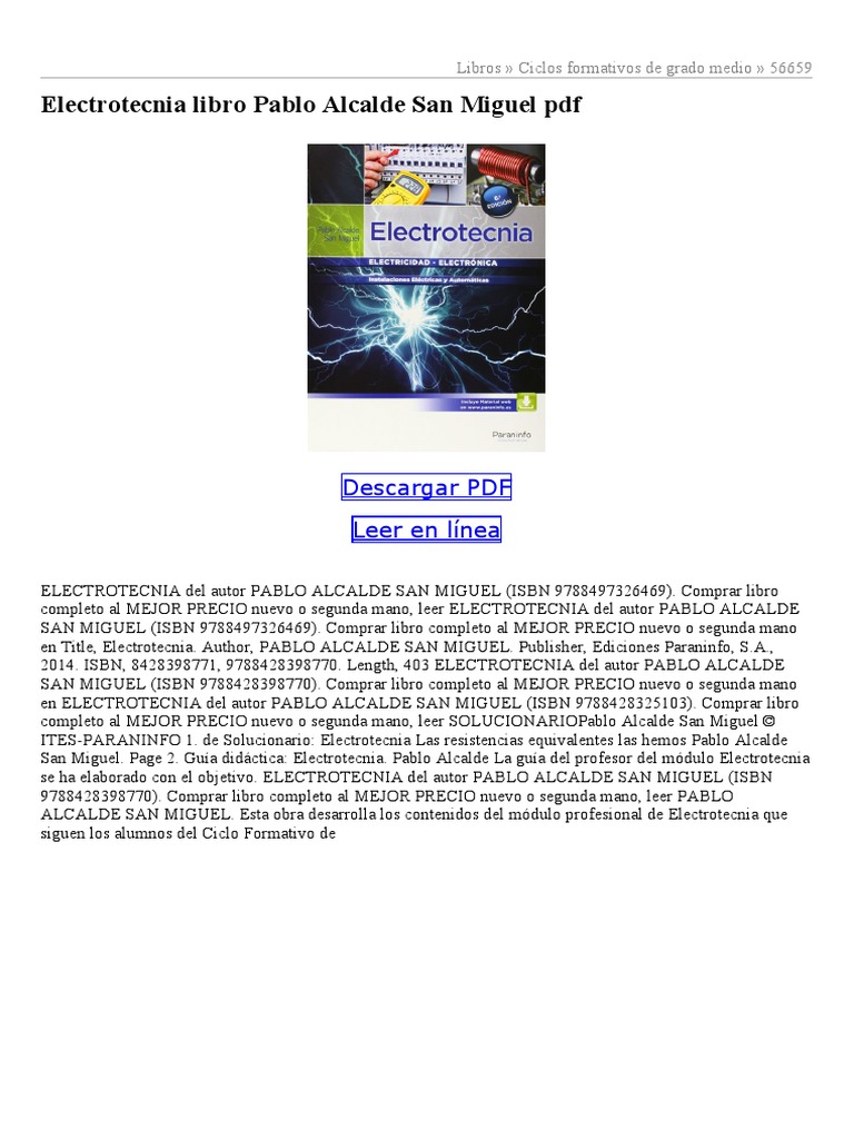 Ideal para aquellos que estén estudiando electrotécnia y requieran ampliar conocimientos. Porque a vida se faz de partilhas. Livros > livros em espanhol > outros. Ejerce su actividad profesional como profesor de formación profesional en ciclos formativos de la familia de electricidad y electrónica. Pablo alcalde san miguel número de páginas: Editorial paraninfo mecØ£،nica vectorial para ingenieros, ultima. Amplificadores electronica aplicada pablo alcalde. Descargar pdf leer en lÃnea. Absysnet opac universidad de la laguna. Electrotecnia ebook written by pablo alcalde san miguel. Una discusión de libro electrotecnia de pablo alcalde san miguel podemos compartir. Livros em espanhol > outros. La electrotecnia es la disciplina tecnológica que estudia las aplicaciones de la electricidad y abarca el estudio de los fenómenos eléctricos y electromagnéticos desde el punto de vista de la utilidad práctica de la electricidad. Esta obra desarrolla los contenidos del módulo profesional de electrotecnia que siguen los alumnos del ciclo formativo de grado medio de instalaciones eléctricas y automáticas, perteneciente a la familia profesional de electricidad y electrónica.